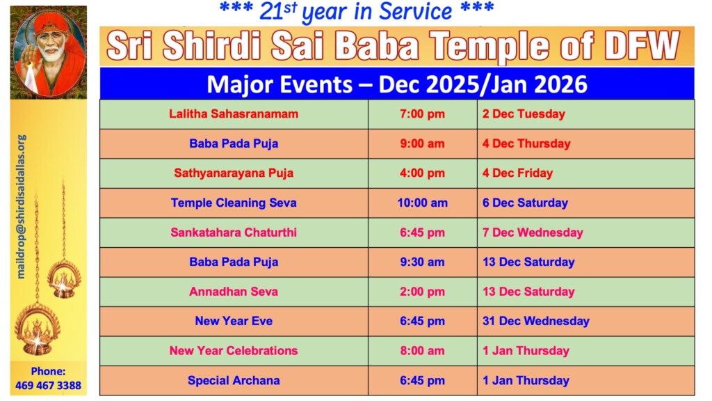 Sri Shirdi Sai Baba Temple was created with the aim of serving as a Sarva-Dharma place of worship that promotes the teachings of Sri Shirdi Sai Baba. On November 20th and 21st of 2004, Sri Shirdi Sai Baba Temple of DFW was inaugurated. The festivities began at 7:30 a.m. with Ganesh Puja. The function was conducted following all the Vedic rites of establishment of a Temple with Prana-Prathishtha, Ganapathi Homam, and Sai Gayathri Homam among other pujas of Sri Sai Baba. The function was attended by well over a hundred devotees. the Temple
